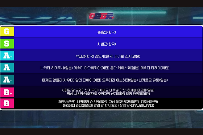 나카타 히데토시(일본), 메흐디 마다비키아(이란), 혼다 케이스케(일본), 메흐디 타레미(올림피아코스·이란)가 티어 A에, 박지성, 김민재(바이에른 뮌헨), 카가와 신지(일본)가 티어 A+에 각각 속했다. 그리고 차범근을 티어 S로 분류했고, 티어 GOAT에는 손흥민 단 한 명만 선정했다.