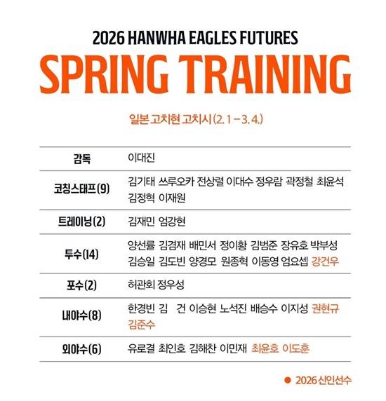 한화는 28일 2026시즌 퓨처스리그 스프링캠프 명단을 발표했다. 이대진 2군 감독을 비롯한 코칭스태프 12명과 선수 30명(투수 14명, 포수 2명, 내야수 8명, 외야수 6명) 등 총 42명이 캠프 명단에 이름을 올렸다. 2026 신인 중에서는 투수 강건우(2R), 내야수 권현규(5R)와 김준수(8R), 외야수 최윤호와 이도훈(이상 육성선수)이 합류했다.