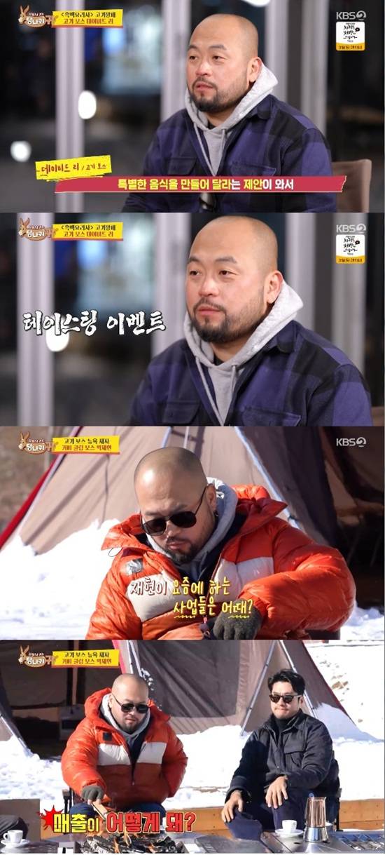 25일 방송된 KBS 2TV '사장님 귀는 당나귀 귀'에서는 데이비드 리가 캠핑장 테이스팅 이벤트에 나서는 모습이 전파를 탔다.