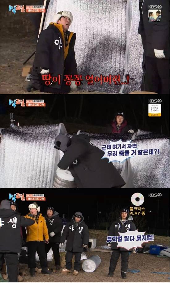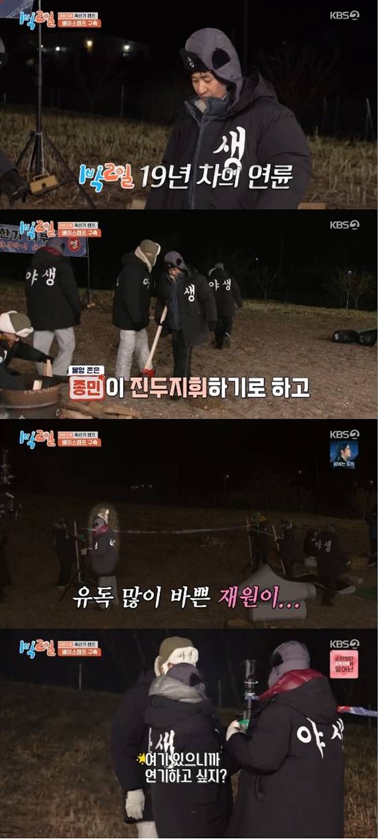25일 방송된 KBS 2TV '1박 2일 시즌4'에서는 김종민, 문세윤, 이준, 딘딘, 유선호가 게스트 붐, 김재원과 혹한기 캠프에 나서는 모습이 전파를 탔다.