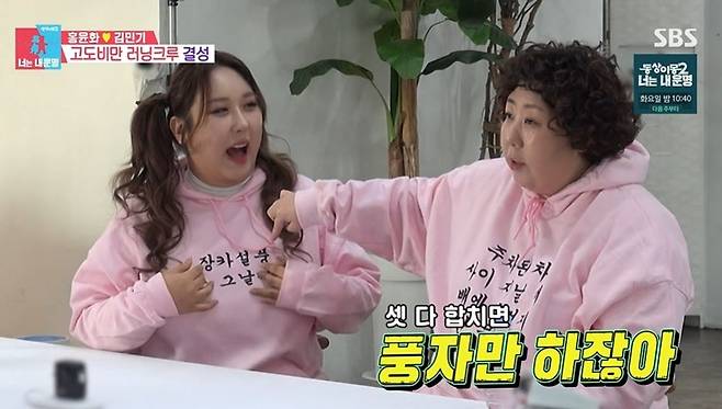 김숙 역시 "2주 전엔 기루 씨보단 더 아담해 보였는데, 지금은 비슷한 것 같다"고 말하기도. 이에 홍윤화는 "많이 찌진 않았다. 2kg 정도 올라왔다"고 하자 신기루는 "일주일에 2kg이면 한 달에 8kg"이라고 경고했다.