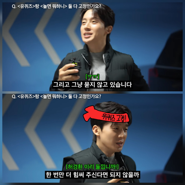허경환은 먼저 ‘놀면 뭐하니?’에 대해 “한 주 한 주 불러주신다”며 여지를 남겼다. 하지만 ‘유퀴즈’에 대해서는 확연히 다른 태도를 보였다. 그는 “유퀴즈는… 솔직히 말하면 살짝 포기한 상태”라며 “이제는 묻지도 않는다”고 털어놨다.