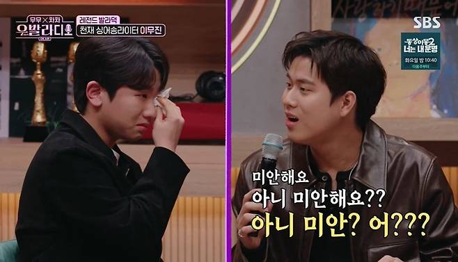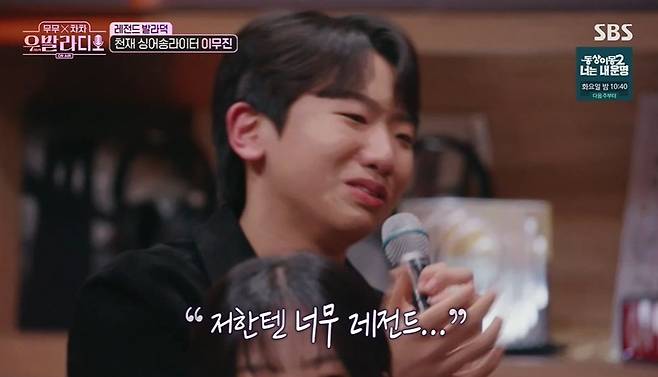 이무진의 찐팬이란 임지성은 눈물을 보이기까지 했다. 당황한 이무진은 "어떡해"라고 외친 후 "미안해요. 제가 뭐라고"라고 말을 잇지 못했다. 임지성은 "'우발라'를 지원한 계기도 이무진 선배님이 '집밥'을 커버한 영상이 있다. 그 노래가 너무 좋아서 어딜 가든 불렀다"라며 팬심을 전했다.