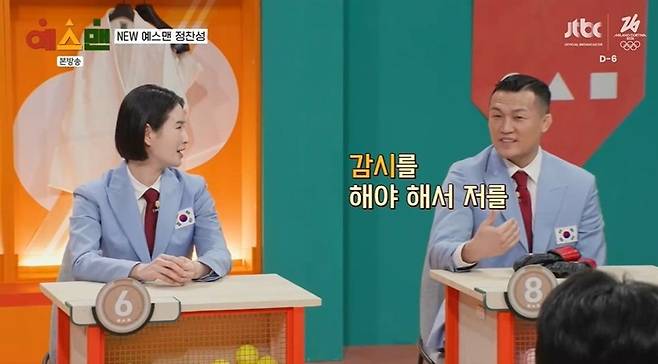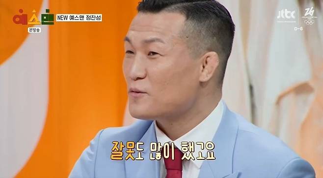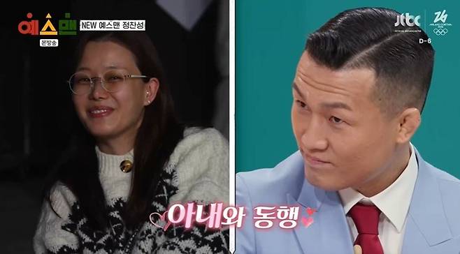 이날 정찬성은 아내와 함께 촬영장에 등장해 눈길을 끌었다. 유일하게 아내와 동행한 '예스맨'이라고. 정찬성은 "이건 자랑할 게 아니라 감시해야 해서"라며 "제가 잘못한 게 많다"라고 밝혔다.