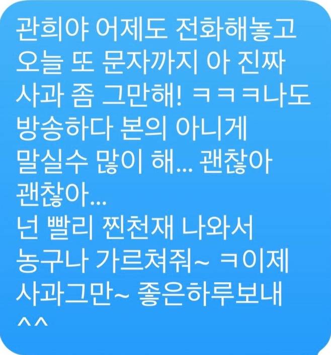 이에 홍진경은 “어제도 전화해 놓고 오늘 또 문자까지, 사과 좀 그만해”라며 “나도 방송하다 보면 말실수 많이 한다. 괜찮다”고 쿨하게 받아넘겼다. 그러면서 “이제 사과는 그만하고 ‘찐천재’ 나와서 농구나 가르쳐줘”라고 덧붙여 분위기를 반전시켰다. 이관희는 “넓은 마음으로 받아주셔서 감사하다”며 예능 출연 의지를 내비쳤다.