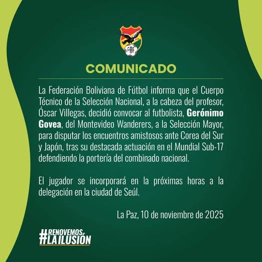 볼리비아 매체 '레드우노'는 11일(현지 시간) 볼리비아축구연맹의 발표를 인용, 오스카르 비예가스 감독이 2025 FIFA(국제축구연맹) 카타르 U-17(17세 이하) 월드컵 볼리비아 U-17 축구 국가대표팀의 주전 골키퍼였던 헤로니모 고베아를 성인 국가대표팀에 발탁했다고 전했다.