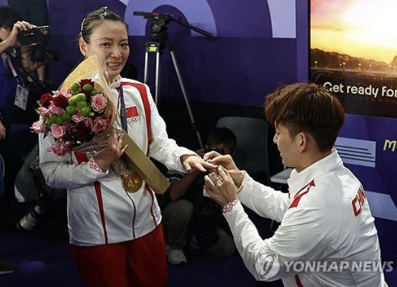 韓 이기고 올림픽 금메달→'전세계 화제' 깜짝 프로포즈→"반지 딱 맞아, YES"…中 배드민턴 커플 드디어 결혼
