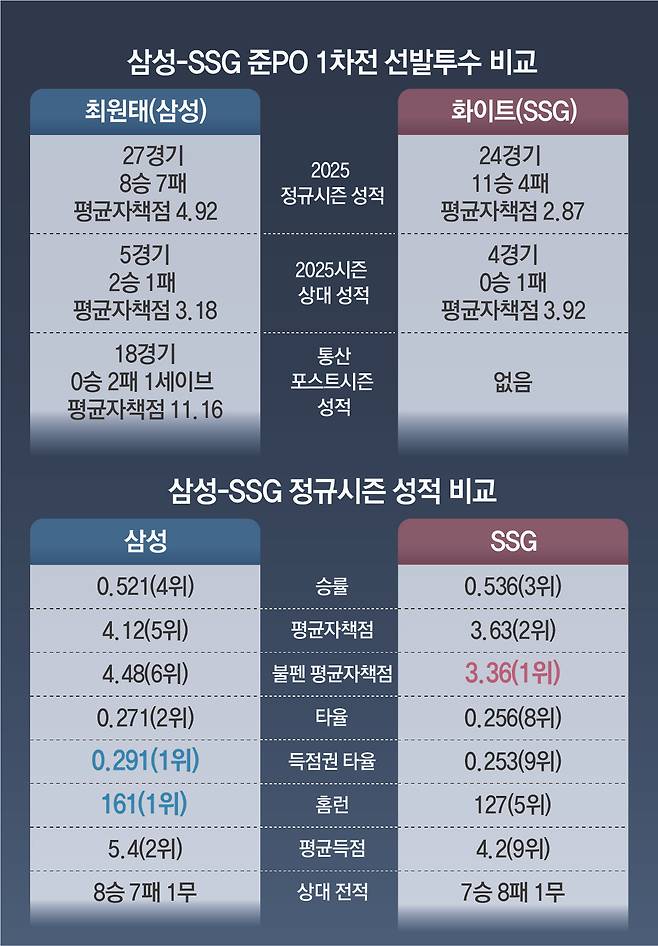 삼성 타자들은 경기 초반부터 최원태에게 힘을 실어줄 필요가 있다. 삼성은 올해 정규시즌에서 홈런(161개)과 득점권 타율(0.291) 1위에 오른 타격의 팀이었다. 하지만 NC와의 WC에서는 구자욱, 디아즈 등 중심 타선이 동반 침묵하며 어려운 경기를 했다. 7일엔 5안타에 그치며 완패했고, 8일엔 안타 하나만 치고도 역대 포스트시즌 최소 안타 기록으로 승리했다. 박진만 삼성 감독(49)은 “SSG는 투수력이 좋다. 초반에 점수를 내야 이길 확률이 커진다”고 말했다.