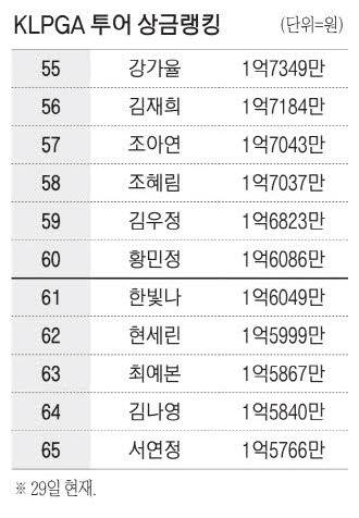 현재 상금 60위 황민정(1억6086만7960원)과 61위 한빛나(1억6049만5000원)의 차이는 37만2960원, 60위와 65위인 서연정(1억5766만889원)의 차이는 320만7071원에 불과하다. 총상금 10억원이 걸린 에쓰오일 챔피언십 상금분배표를 보면 컷 통과 후 최하위인 60위가 받는 상금은 550만원이나 된다. 60위 인근에 포진한 선수라면 안심할 수도 없고, 포기하기에도 이르다.