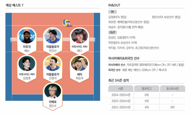 배구에서 공격과 수비를 모두 완벽하게 해내는 공수겸장은 정말 찾기 어렵다. 그래서 대부분의 팀은 공격과 수비 중 어느 한 쪽으로 살짝이라도 기우는 컬러를 선택할 수밖에 없다. 한국전력의 선택은 공격력 극대화였다. 수비와 리시브에서 탄탄함을 갖춘 임성진이 FA 이적으로 떠났지만, 그 자리를 서브와 파이프가 돋보이는 김정호로 메웠다. 여기에 아시아쿼터로 198cm의 신장에 강력한 서브와 오픈공격 능력을 갖춘 에디를 선택한 뒤, 아웃사이드 히터로 기용하는 강수까지 준비했다. 방패를 내려놓고 칼을 두 자루 쥔 검투사와 같은 팀이 됐다. 동시에 공략 당할 약점은 많아졌다. 대신 상대가 조금이라도 방심하면 언제든 그 빈틈을 후벼 팔 수 있도록 칼을 갈았다. 여기에 최소한의 보험도 들었다. 베테랑 리베로 정민수를 영입하며 수비 라인 조율을 맡겼다. 그렇게 한국전력의 번개 폭풍이 몰아칠 시즌이 다가왔다.