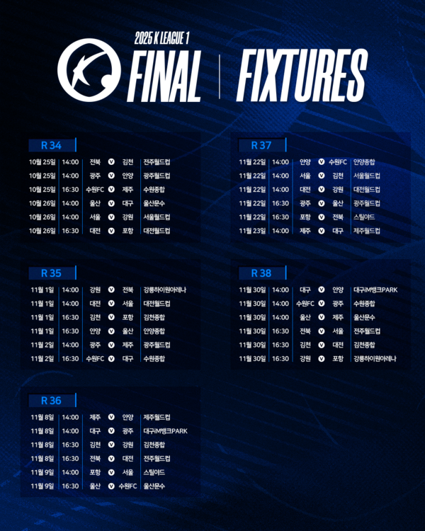 20일 한국프로축구연맹은 '하나은행 K리그1 2025' 파이널라운드 일정을 발표했다. 파이널라운드는 정규라운드 종료 후 상, 하위 각 6개 팀으로 나뉘어 진행되며, 34라운드부터 38라운드까지 각 팀이 5경기씩 치른다.