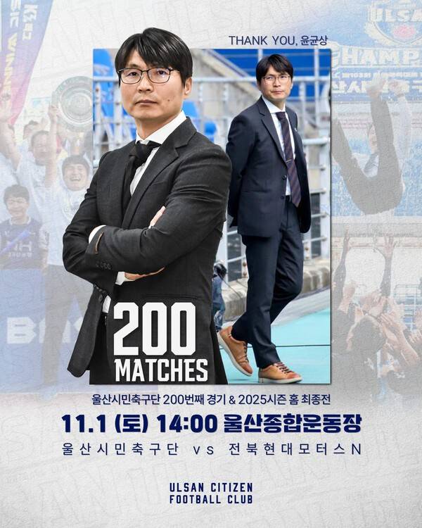전북전은 200경기 모두 지휘봉을 잡고 터치라인에 선 윤균상 감독의 고별전으로 치러진다. 윤균상 감독은 K3·K4리그 통틀어 가장 운영비가 적은 축에 속하는 울산을 이끌고 2019 K3리그 베이직 우승, 2020 K4리그 준우승, 2022년 제103회 전국체육대회 금메달, 2023 K3리그 4위 등 업적을 달성했다.