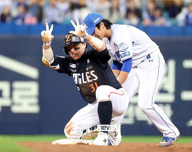 한화 이글스는 24일 대전 한화생명볼파크에서 열린 '2025 신한 SOL뱅크 KBO 포스트시즌' 삼성 라이온즈와 플레이오프 5차전에서 11-2로 크게 이겨 한국시리즈에 진출했다. 1번 지명타자로 나온 손아섭은 1회 첫 타석 안타를 포함해 4타수 2안타 1볼넷으로 리드오프 몫을 충분히 해냈다. 그리고 19년 만의 첫 한국시리즈 출전이라는 기쁨을 누렸다.