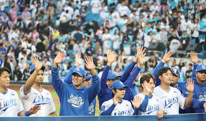 ▲ 7일 대구 삼성라이온즈파크에서 열린 2025 KBO 포스트시즌 와일드카드 2차전 삼성 라이온즈와 NC 다이노스의 경기. 삼성 선수들이 승리한 뒤 기뻐하고 있다.