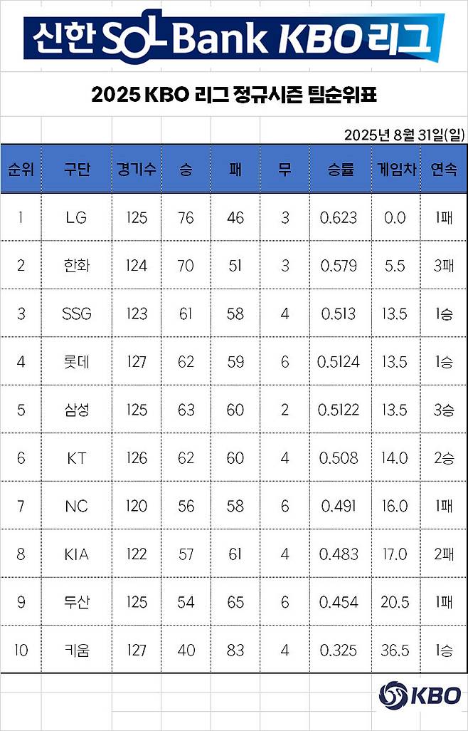 가을의 문턱, 순위 싸움은 이제 백열전이다. 순위표가 매일 롤러코스터처럼 요동친다. 3~8위가 불과 3.5경기 차이다. 3~5위는 아예 승차가 없다. 한 번의 승리와 한 번의 패배로 순위가 바뀐다. 8월의 마지막 밤(31일)에도 ‘1승’을 향한 에스에스지(SSG) 랜더스, 롯데 자이언츠, 삼성 라이온즈, 케이티(KT) 위즈, 엔씨(NC) 다이노스, 기아(KIA) 타이거즈 등 6개 팀의 사투가 이어졌다. 가장 뜨거운 팀은 발톱을 세운 삼성이다.