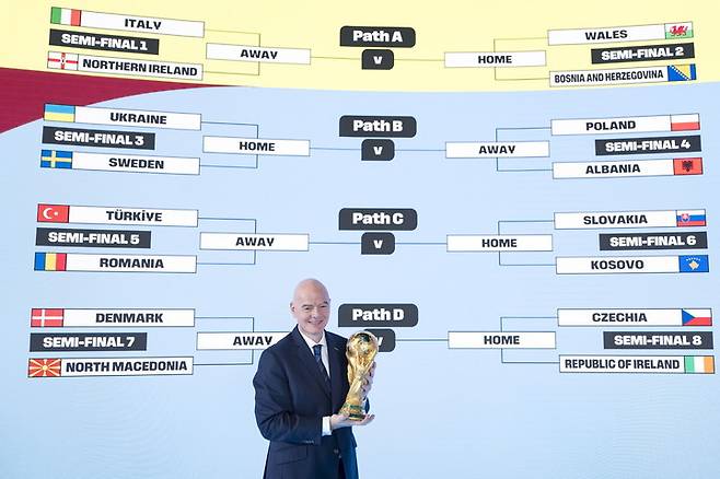 국제축구연맹(FIFA)은 지난 20일(한국시간) 스위스 취리히 FIFA 본부에서 2026 북중미 월드컵 대륙간 PO 대진 추첨식을 열었다.