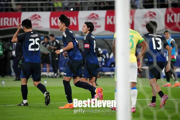 일본은 14일 오후 7시 30분(한국시간) 도쿄 아지노모토 스타디움에서 열린 브라질과의 친선경기에서 3-2로 짜릿한 역전승을 거뒀다. 초반 분위기는 완전히 브라질의 것이었다. 전반 26분 브루노 기마랑이스의 전진 패스를 받은 루이스 엔리케가 선제골을 터뜨렸고, 불과 6분 뒤 루카스 파케타의 스루패스를 받은 가브리엘 마르티넬리가 왼발 슈팅으로 추가골을 넣었다.