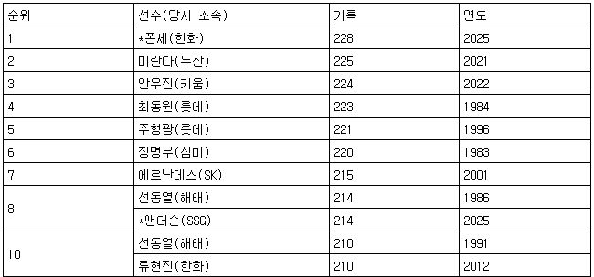 여기에 NC 다이노스 라일리 톰슨(탈삼진 184개), 폰세의 한화 동료 라이언 와이스(탈삼진 180개)도 200탈삼진 고지에 다가서고 있다.