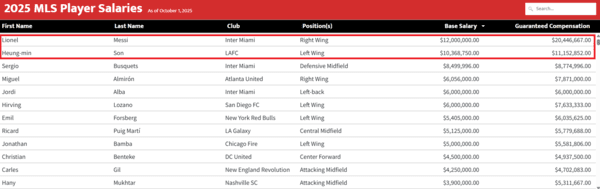 최근 MLS선수협회(MLSPA)가 발표한 2025 시즌 연봉 가이드에 따르면, MLS에서 가장 많은 연봉을 받는 선수는 리오넬 메시(인터 마이애미)로, 연간 2,044만 6,667달러(약 298억 원)를 수령하고 있다. 손흥민은 1,115만 2,852달러(약 162억 원)로 전체 2위를 기록했다.