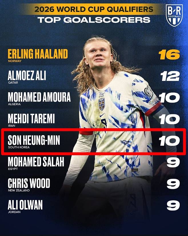 글로벌 축구매체 'BR풋볼'은 20일(한국시간) 사회관계망서비스(SNS)를 통해 2026 국제축구연맹(FIFA) 북중미 월드컵(캐나다·미국·멕시코 공동개최) 예선 최다 득점자를 소개했다.