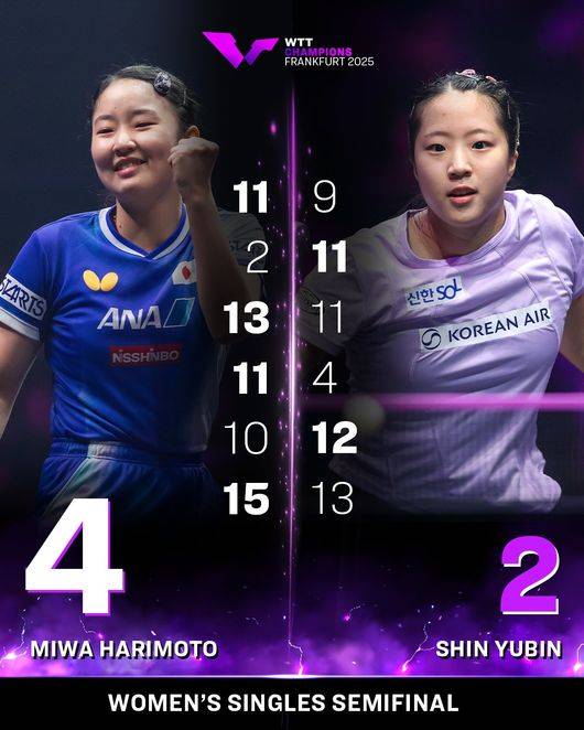 세계 랭킹 12위 신유빈은 9일(한국시간) 독일 프랑크푸르트 쉬바크 에네르기 아레나에서 열린 WTT 챔피언스 프랑크푸르트 여자단식 4강에서 랭킹 7위 하리모토에게 54분의 접전 끝에 2-4(9-11 11-2 11-13 4-11 12-10 13-15)로 패했다.