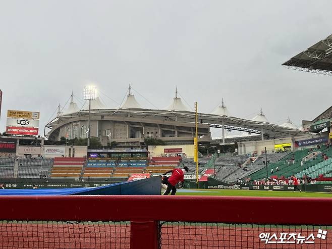 아직도 걷지 못한 대형 방수포…한화-SSG전, 우천으로 개시 지연 [인천 현장]