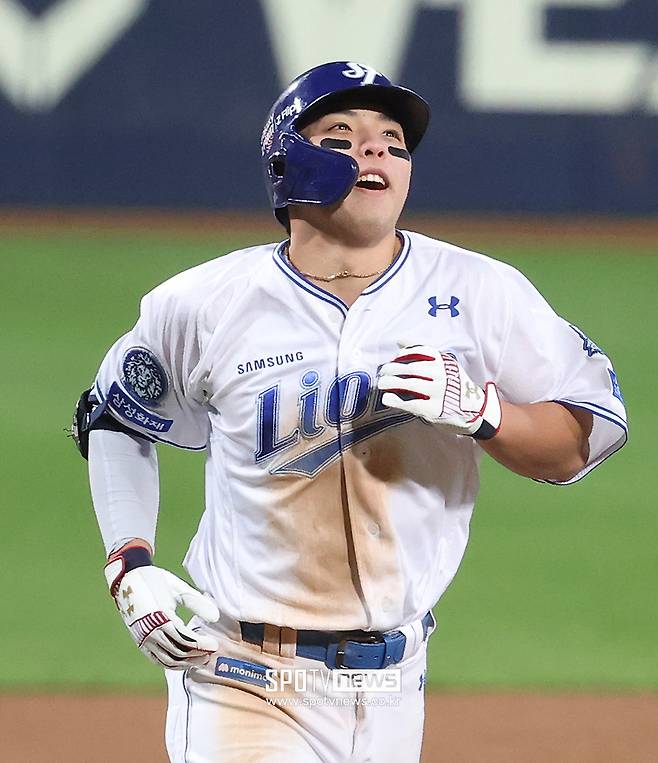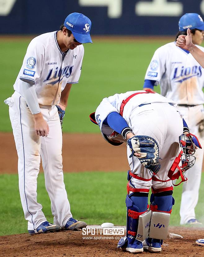 [스포티비뉴스=대구, 곽혜미 기자] 18살 차 대선배가 먼저 허리를 숙였다. 삼성 베테랑 포수 강민호가 결정적 홈런을 터뜨린 김영웅에게 90도 인사를 했다.