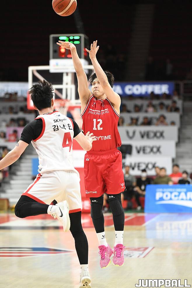이날 김영현의 임무는 확실했다. SK 주전 포인트가드 김낙현의 전담 수비였다. 시작부터 김영현은 김낙현을 악착 같이 따라다녔다. 아예 공을 잡지 못하게 강하게 압박했다.