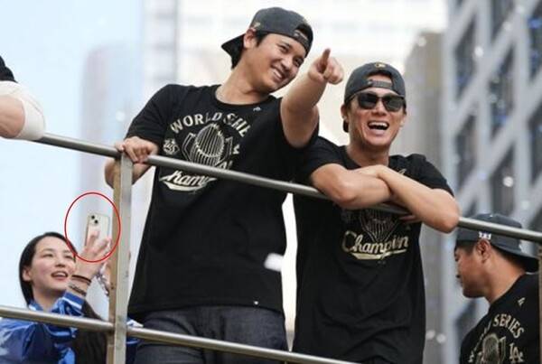 오타니 부부는 2층 버스의 오픈 데크에서 팬들에게 손을 흔들며 미소를 보였고, 서로 사진을 찍으며 즐거운 시간을 보냈다. 그중에서도 주목받은 것은 마미코가 들고 있던 스마트폰이 최신형이 아닌 출시한지 4년이 지난 아이폰 13 미니였다.