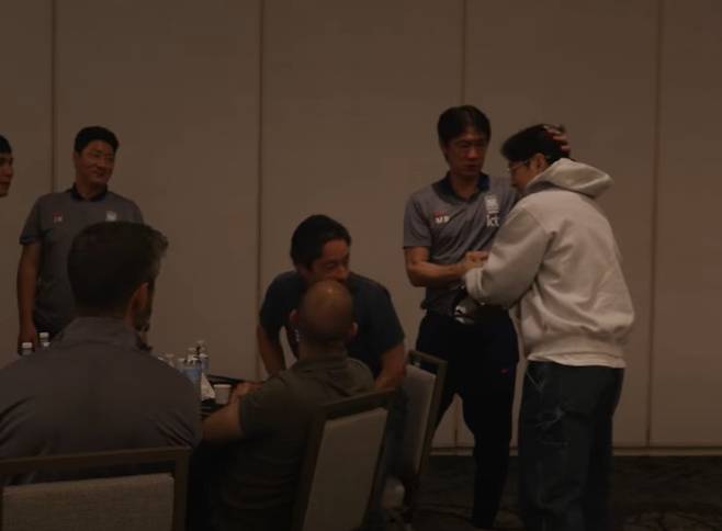 이어 모자를 벗고 홍명보 감독에게 다가가 인사를 건넸다. 이에 홍 감독은 이강인과 악수를 나눈 뒤, 그의 머리를 쓰다듬으며 환영했다.