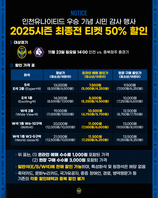 이번 할인 행사는 오는 11월 23일(일) 인천축구전용경기장에서 열리는 충북청주FC전 홈경기를 대상으로 진행되며, 올 시즌 인천유나이티드를 응원해 준 시민과 팬들에게 감사의 뜻을 전하기 위해 마련됐다.