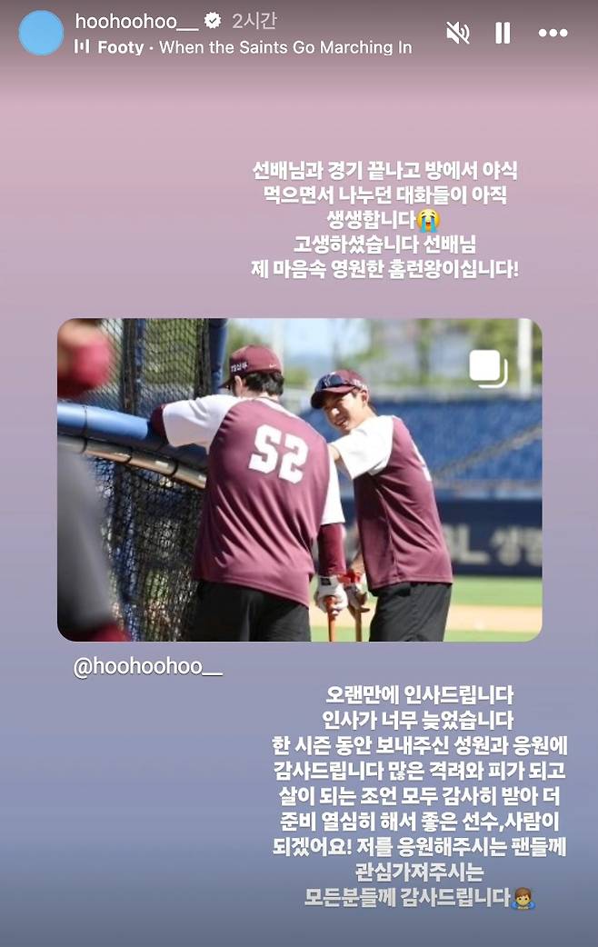 이정후는 "선배님과 경기 끝나고 방에서 야식 먹으면서 나누던 대화들이 아직 생생합니다"라고 눈물 짓는 이모티콘을 올린 후 "고생하셨습니다 선배님. 제 마음 속 영원한 홈런왕이십니다"라고 적었다.