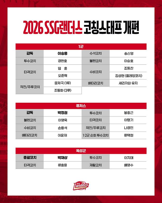 SSG는 선수단 운영을 1군-퓨처스(2군)-육성군의 3군 체계로 전환하며, 퓨처스와 육성군 선수를 기존 55명에서 69명으로 확대했다. 이에 따라 선수 개별 성장을 지원하기 위해 코칭스태프도 32명에서 38명으로 늘려 전문 인력을 대폭 보강했다. 이번 개편은 이러한 구조 변화를 바탕으로 3군 간 소통과 팀워크를 강화하고, 선수 성장 중심의 지도 체계와 과학적 육성 기반을 구축하는 데 초점을 맞췄다.