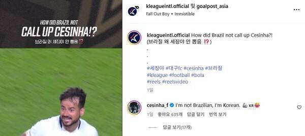 특히 소속팀 대구FC가 강등권으로 쳐지며 흔들리는 와중에도 언제나 그렇듯 미친 워크에식을 선보이며 팬들로부터 큰 지지를 얻고 있다. 이날 kleagueintl.official은 "브라질 왜 세징야 안 뽑음?"이라는 말로 경의를 표했다. 그러자, 세징야는 "나는 브라질 사람이 아니다. 한국인이다"라는 농담으로 화답했다.