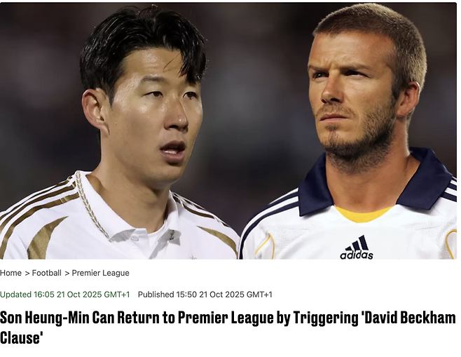 이런 가운데, 영국 언론들은 손흥민의 겨울 유럽 복귀 가능성을 잇따라 보도했다. ‘더 선’과 ‘스포츠바이블’은 “손흥민의 LAFC 계약에는 유럽 단기 임대를 허용하는 옵션이 포함되어 있다”며 “그가 MLS 비시즌 동안 프리미어리그에 복귀할 수 있다”고 전했다. 보도에 따르면, 이는 과거 데이비드 베컴이 LA갤럭시 시절 AC밀란으로 임대됐던 방식과 유사하다.