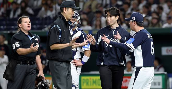 경기 주심을 맡은 메이저리그 역사상 첫 여성 심판 젠 파월이 5회초 문현빈의 안타를 아웃으로 오심하고, 5회말에도 도쿄돔의 로컬룰을 숙지하지 못해 판정을 번복하는 등 경기 운영이 매끄럽지 않았으나 실력 차를 덮을 수 있는 핑계는 되지 못했다.