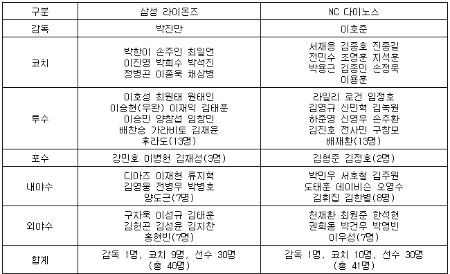 포수는 강민호, 이병헌, 김재성 등 3명이 엔트리에 들어갔고, 내야수는 르윈 디아즈, 이재현, 류지혁, 김영웅, 전병우, 박병호, 양도근, 외야수는 구자욱, 이성규, 김태훈, 김헌곤, 김성윤, 김지찬, 홍현빈이 나선다.
