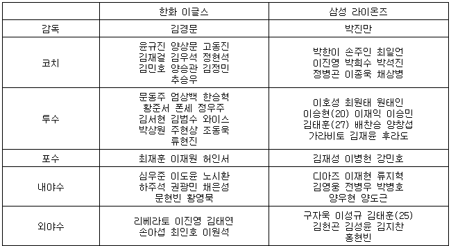 두 팀 모두 포수 3명, 내야수 8명씩으로 같지만, 투수는 한화가 1명 더 많고, 삼성은 외야수 7명을 등록해 6명의 한화와 차이를 보였다.