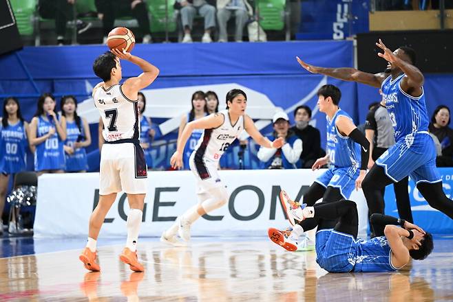 한국가스공사와 부산 KCC는 지난 18일 대구실내체육관에서 피 터지게 싸웠다. 두 팀의 승부는 연장전으로 향했고, 두 팀은 연장전에도 팽팽하게 맞섰다. 연장전 종료 1분 18초 전에도 1점 차였다.