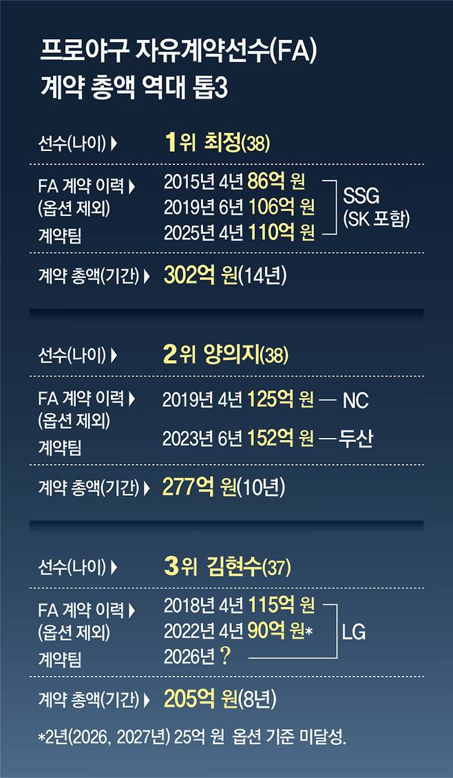 차명석 LG 단장은 “두 선수 모두 (염경엽) 감독님이 꼭 잡아 달라고 요청했다. 우리 팀에 꼭 필요한 선수들이라고 확신하고 있다”면서 “(김현수의 경우) 일단 이번에 달성 실패한 옵션(2년 25억 원)은 보장해주고 얘기를 들어볼 것”이라고 했다. 여전한 실력에 우승 프리미엄까지 감안하면 계약액은 더 높아질 수 있다.