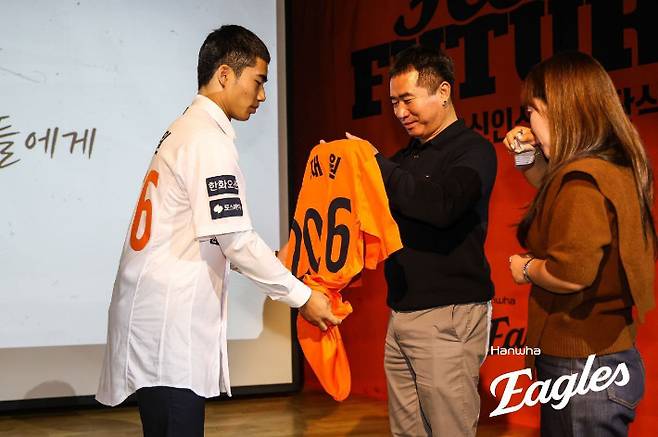 한화는 11일 대전 중구 소재 대전중구문화원에서 2026 신인 선수들의 입단식 '헬로 퓨처!(Hello Future!)'를 개최했다. 선수들이 직접 자신의 이름이 새겨진 유니폼을 부모님께 입혀드리고 마음속으로만 간직했던 감사의 뜻을 손편지로 적어 전하는 등 훈훈한 분위기가 만들어졌다.