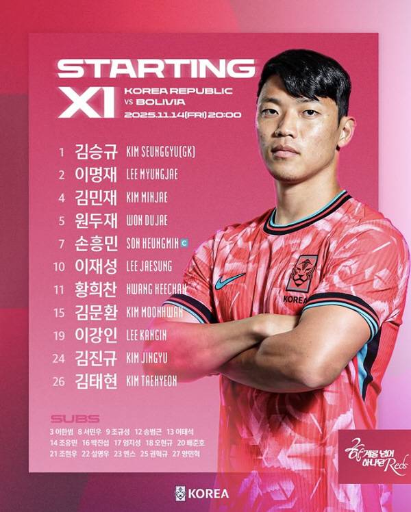 [현장라인업]'손흥민 선봉-이강인 2선-조규성 벤치' 포백 돌아온 홍명보호, 볼리비아전 선발 발표