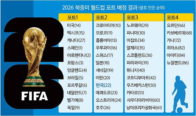 포트1에는 공동 개최국 캐나다, 멕시코, 미국이 자동 배치됐고, FIFA 랭킹 1위 스페인부터 아르헨티나, 프랑스, 영국, 브라질, 포르투갈, 네덜란드, 벨기에, 9위 독일까지 차례로 포함됐다. 북중미 월드컵 본선 조 추첨은 다음 달 6일 오전 미국 워싱턴 케네디센터에서 진행된다.