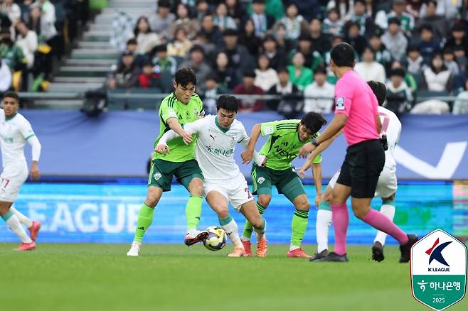 전북도 전반 37분 왼쪽에서 넘어간 크로스를 전진우가 반대편에서 헤더로 연결하고 박재용까지 연결하려 했지만, 이준서가 눈치채고 앞으로 달려 나와 잡아냈다.