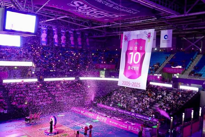 현역 시절 활약상을 편집한 특별 영상에 이어 흥국생명 구단이 김연경이 설립한 KYK재단에 유소년 배구 발전 등을 위해 써달라며 기부금을 전달하는 순서가 진행됐다.