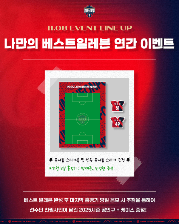 김천은 다양한 연간 이벤트로 홈 팬을 맞이한다. 먼저 '나만의 베스트 일레븐' 이벤트에서 유니폼 스티커북과 민경현, 박태준 스티커를 제공한다. 베스트11을 완성하고 마지막 홈경기 당일 응모 시 추첨을 통해 선수단 친필사인 공인구와 케이스를 받을 수 있다.