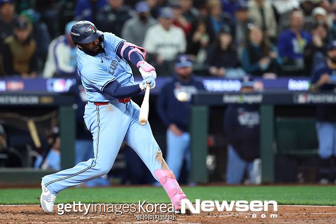 시애틀 선발 커비는 4이닝 8실점으로 무너졌다. 카를로스 바르가스가 1이닝 2실점, 케일럽 퍼거슨이 2이닝 2실점, 루크 잭슨이 2이닝 1실점을 추가로 기록하는 등 불펜도 부진하며 완패했다.(사진=블라디미르 게레로 주니어)