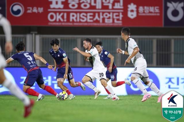 양 팀 모두 교체 없이 후반전에 임한 가운데, 후반 시작 2분 만에 충북청주가 페드로의 연속 슈팅으로 달라진 공격력을 선보였다. 김 감독이 사전 인터뷰에서 기대를 표했던 이승재의 슈팅까지 나왔다. 그러나 골과는 거리가 있었다.