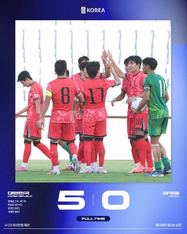 이민성 감독이 이끄는 대한민국 U-22 남자 축구 국가대표팀은 3일 오후 5시 30분(한국시간) 인도네시아 시도아르조에 위치한 겔로라 델타 스타디움에서 열린 2026 아시아축구연맹(AFC) U-23 아시안컵 예선 J조 1차전에서 마카오를 5-0으로 눌렀다.