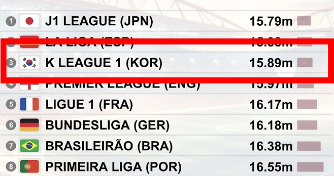 CIES에 따르면 한국의 프로축구 최상위리그인 K리그1은 이 통계에서 15.89m를 기록하며 일본 J1리그(15.79m), 스페인 라리가(15.88m)에 이어 3위를 차지했다. 15.89m는 페널티지역의 세로선보다 약간 짧은 수준이다.